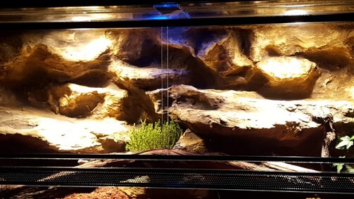 A terrárium hátterén fontosak a kiugró párkányok ahol a kígyónk kényelmesen elfér. Több kiugróval minden hőmérsékleti igényt kielégítő életteret tudunk biztosítani kígyónk számára. A párkányok alatt pedig kiváló búvóhelyet talál. A beültetett növények még élhetőbbé és természetessé teszik a terrárium belsejét.