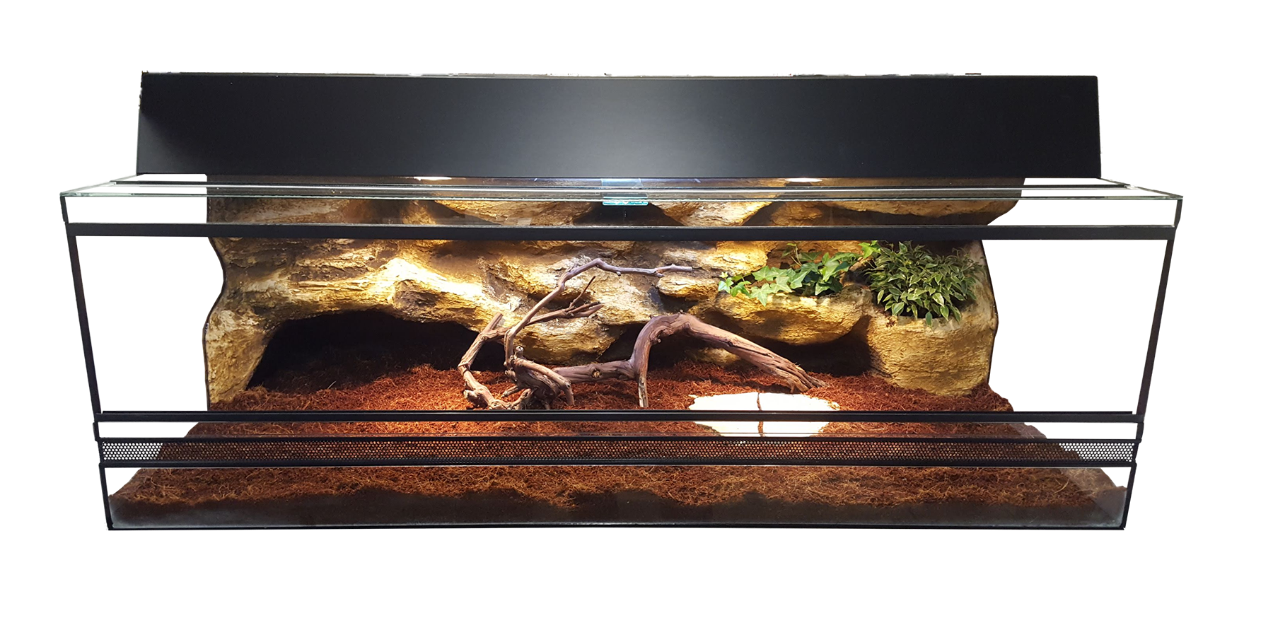 Az ár tartalmazza a tolóajtós terráriumot, szellőzőkkel. Háterezés, barlanggal, növényültetési lehetőséggel. Világítás két melegítő és egy UVB izzóval. Kókuszrost aljzat, etető szikla, növények. Ezeket feljebb megtalálja részletesebben leírva.